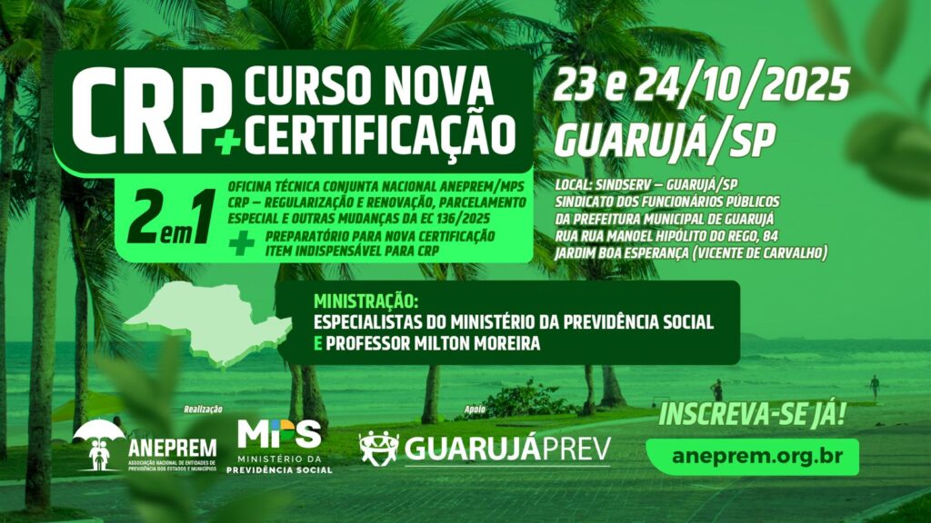 Nos dias 23 e 24 de outubro, Guarujá receberá um curso presencial preparatório para Certificação em RPPS e Oficina Técnica. A iniciativa da Associação Nacional de Entidades de Previdência dos Estados e Municípios (ANEPREM) e do Ministério da Previdência Social (MPS) tem apoio da GuarujáPrev, autarquia responsável pelo regime de previdência social dos servidores públicos municipais de Guarujá.