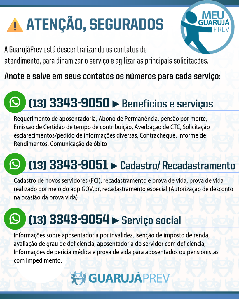 A GuarujáPrev, autarquia responsável pelo regime de previdência social dos servidores públicos municipais de Guarujá, está descentralizando o atendimento aos seus segurados, com o objetivo de dinamizar o serviço e agilizar as principais solicitações. Para isso, recomenda que os servidores, aposentados e pensionistas salvem em seus contatos os novos números de atendimento para cada situação.